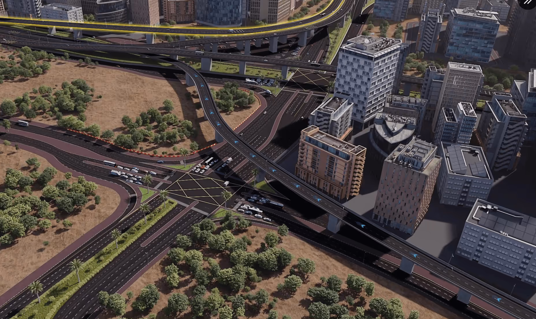 The project includes 4.8 kilometres of roads, surface intersection improvements, two pedestrian bridges, street lighting, traffic systems, a storm water drainage network and an irrigation system.